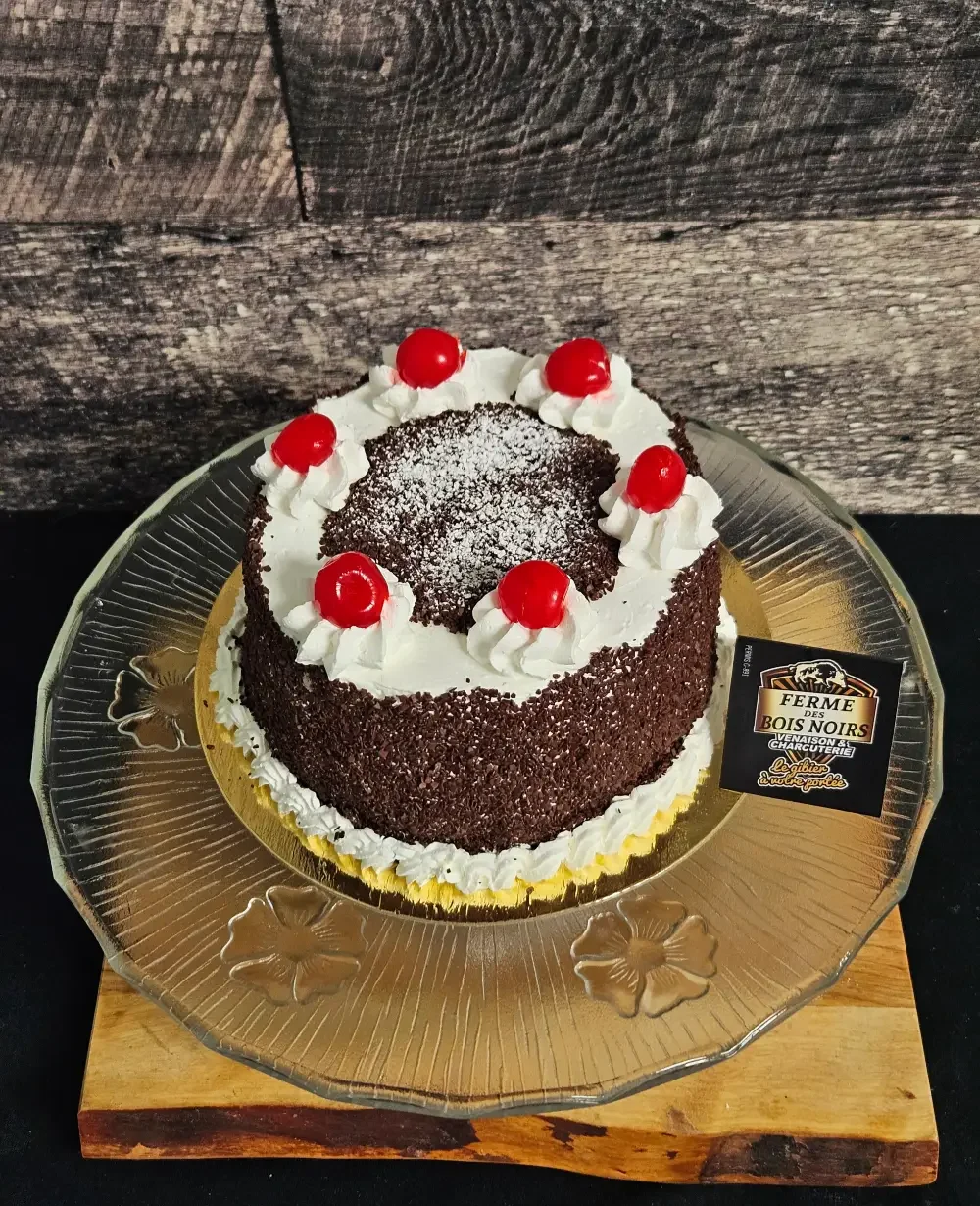Ingrédients : Génoise chocolat, sirop kirch, crème fouettée, cerise, chocolat.