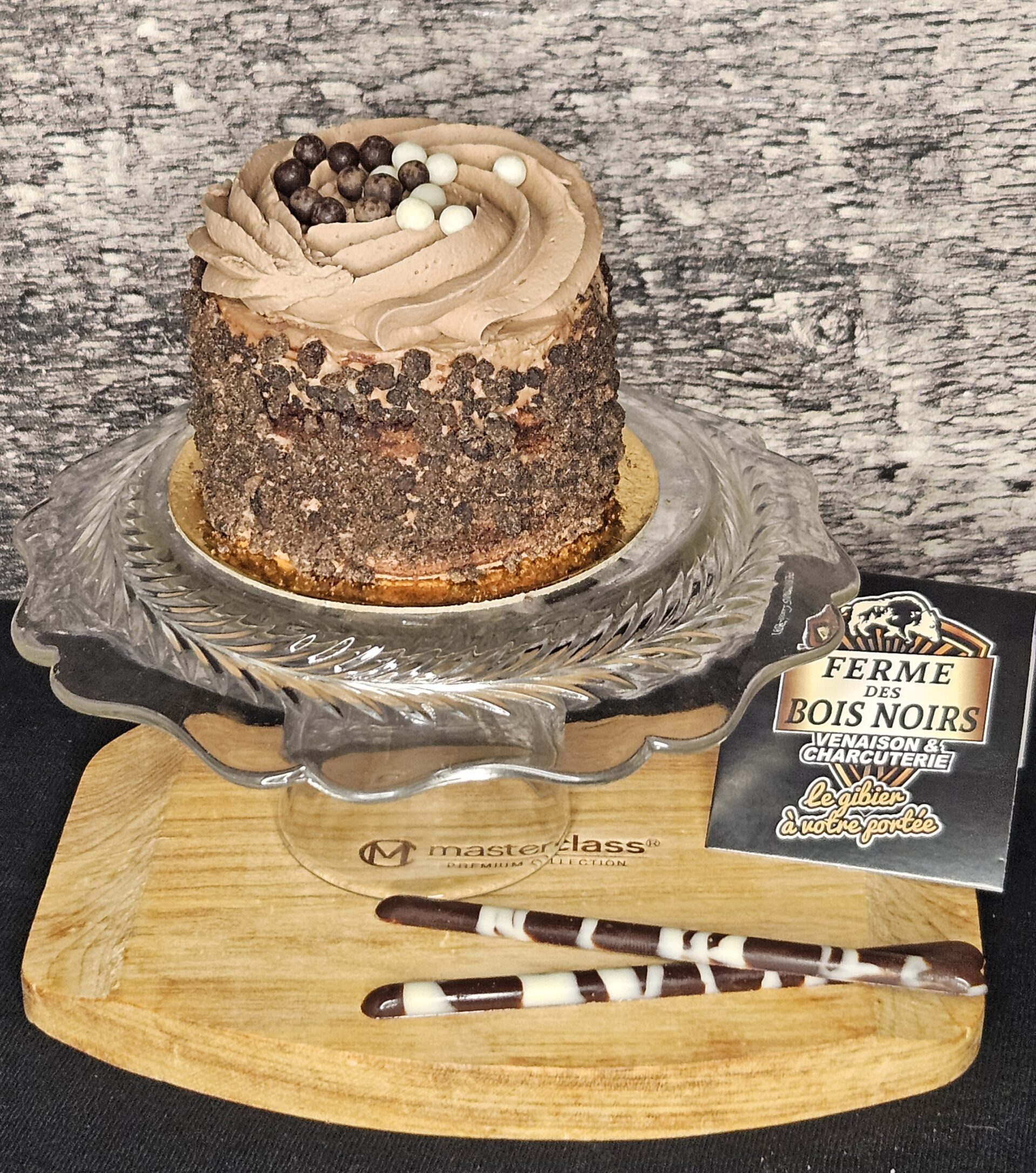 Ingrédients : Génoise chocolat, mousse chocolat, miroir chocolat, crème au beurre vanille, biscuit choco sèche, chocolat.