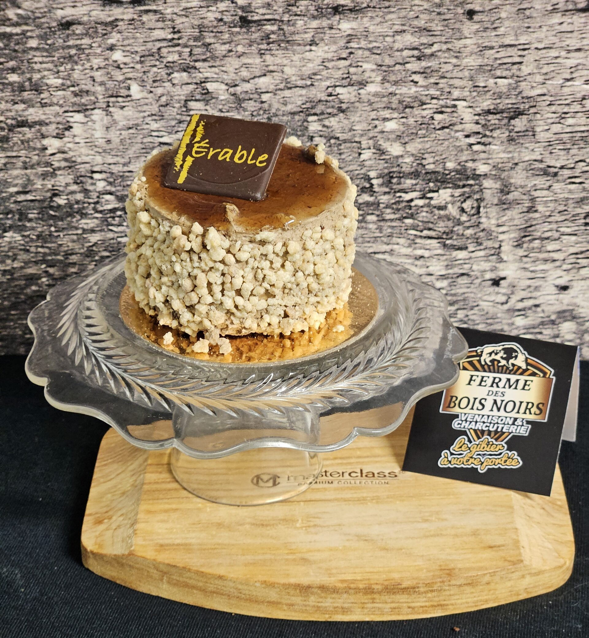 Ingrédients : Génoise érable, Mousse érable, Miroir érable-choco, crème au beurre, biscuit vanille sèche.