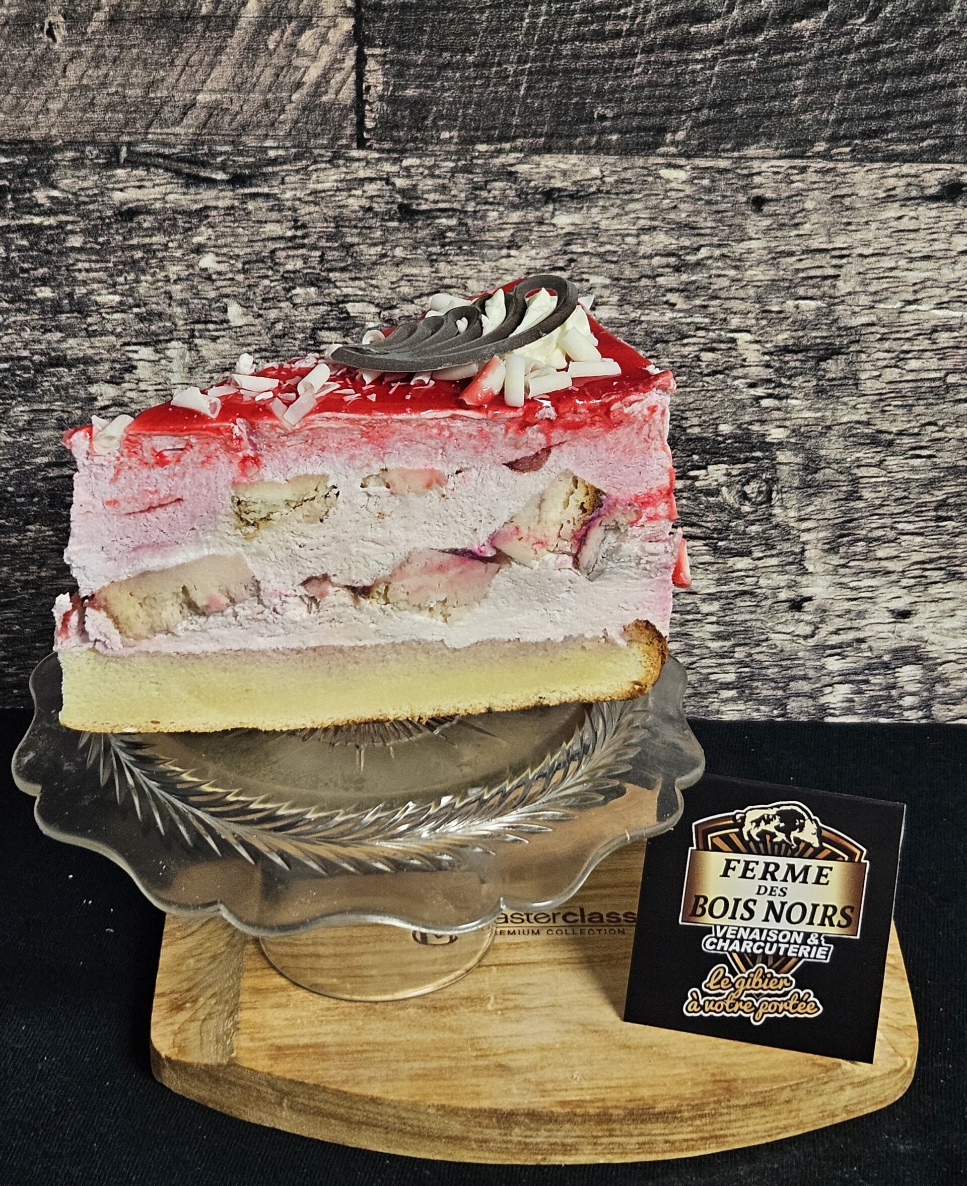 Ingrédients : Génoise vanille, mousse framboise, gateaux fromage, coulis framboise, miroir rouge, chocolat blanc, crème au beurre vanille gélifiée